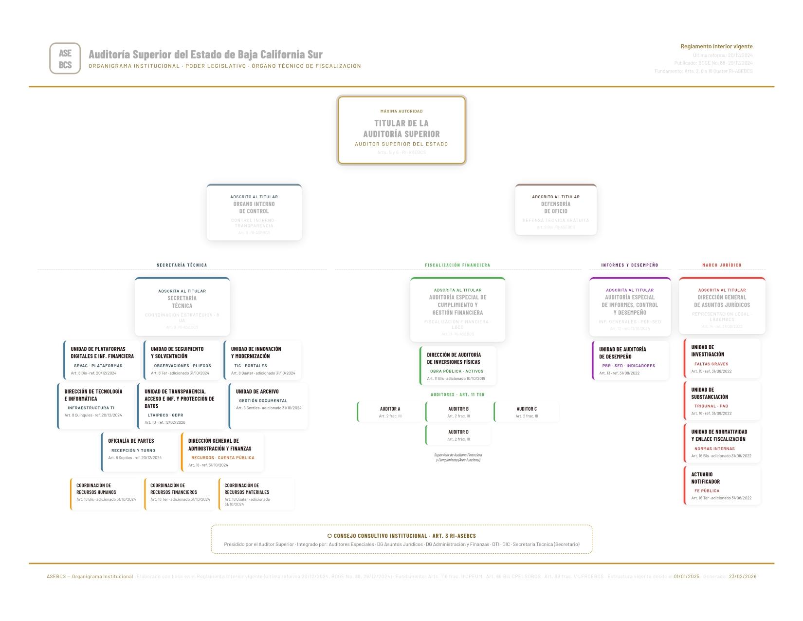La Auditoría Superior del Estado de Baja California Sur, es el órgano técnico de fiscalización del Poder Legislativo, que tiene a su cargo la fiscalización superior, así como las demás funciones que expresamente le encomienden la Constitución Política del Estado Libre y Soberano de Baja California Sur, la Ley de Fiscalización y Rendición de Cuentas del Estado de Baja California Sur y demás ordenamientos legales aplicables.